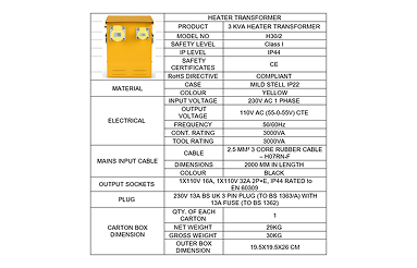 The Heater Transformer is a 3 KVA isolation transformer designed for safe and efficient power conversion in heating applications. It steps down 230V AC to 110V AC (55-0-55V CTE) and is housed in a mild steel IP22 case. CE certified, RoHS compliant, and IP44-rated at the sockets, it ensures reliable operation in varied environments.