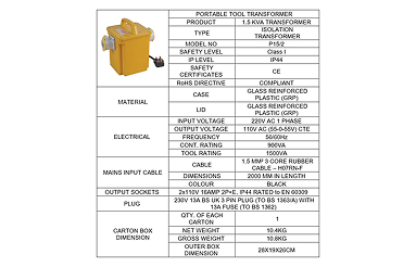 The Portable Tool Transformer P15/2 is a 1.5 KVA isolation transformer designed for enhanced safety in industrial and construction environments. It steps down 220V to 110V AC (55-0-55V CTE) with IP44 protection. Built using GRP casing and certified to CE and RoHS standards, it ensures safe tool operation with durable, portable, and compact design.