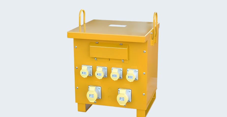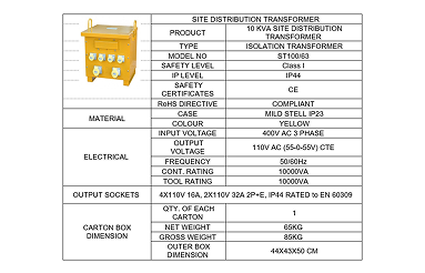 The ST100/63 is a 10 kVA three-phase Site Distribution Transformer built for high-load industrial and construction power needs. It converts 400V AC input to 110V AC (55-0-55V) output with CE and RoHS compliance. Housed in a durable mild steel IP23 casing and featuring IP44-rated sockets, it delivers safe, portable, and efficient tool power on-site.